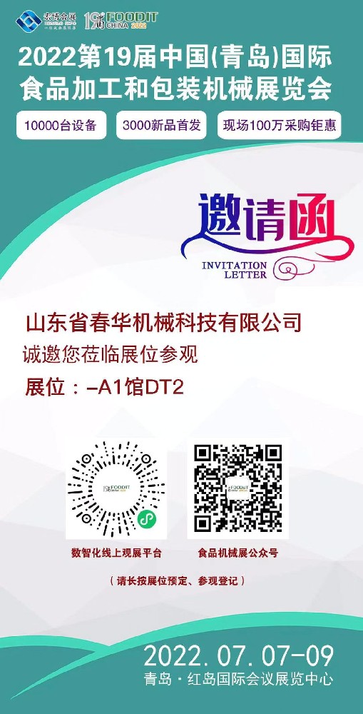 2022第19届中国(青岛)国际食品加工和包装机械展览会时间:2022.07.07-09展位号:-A1馆DT2…